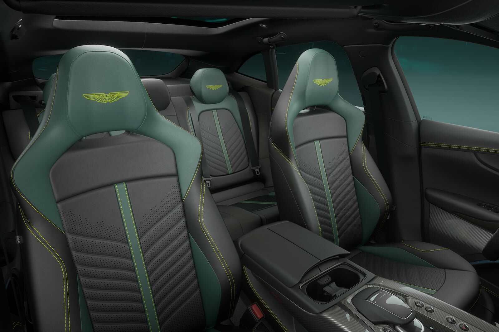Плюшевый интерьер также был украшен несколькими украшениями, вдохновленными F1. Откройте двери, и вас встретит логотип AMR23 на порогах. В роскошном салоне с кожаной отделкой Aston Martin выбрал тему интерьера Inspire Sport Duotone, которая позволяет выбрать два цвета. Onyx Black и Eifel Green вместе создают утонченную атмосферу, усиленную прострочкой и деталями цвета Lime Green.