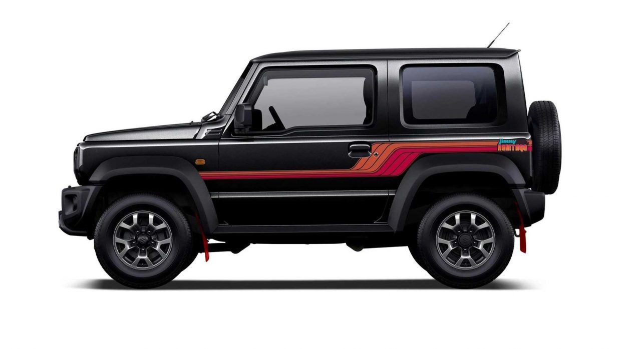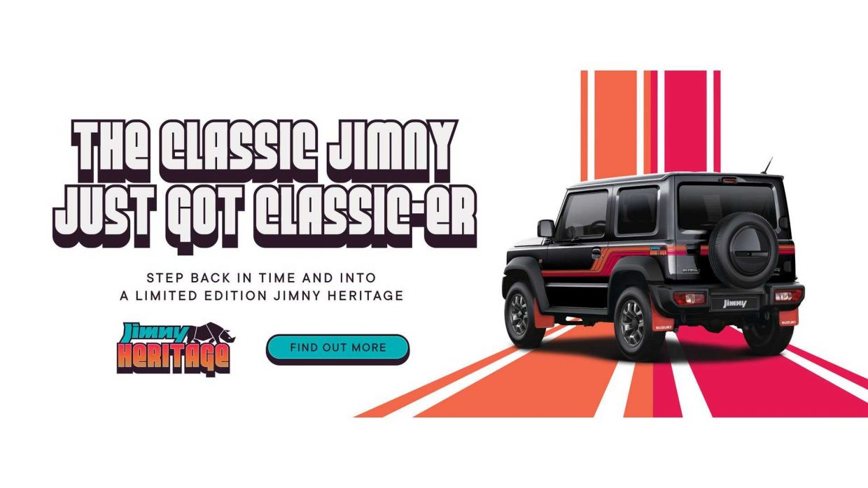 .Всего выпущено всего 300 экземпляров, Suzuki Jimny Heritage основан на уровне отделки салона GLX и оснащен красными брызговиками спереди и сзади, а последний украшен тиснением Suzuki . В комплект входят наклейки на кузов в стиле ретро, и клиенты могут заказать автомобиль с окраской Black Pearl, Jungle Green, White или Medium Grey. Все автомобили ездят на 15-дюймовых легкосплавных дисках и продаются исключительно с пятиступенчатой механической коробкой передач и полным приводом.